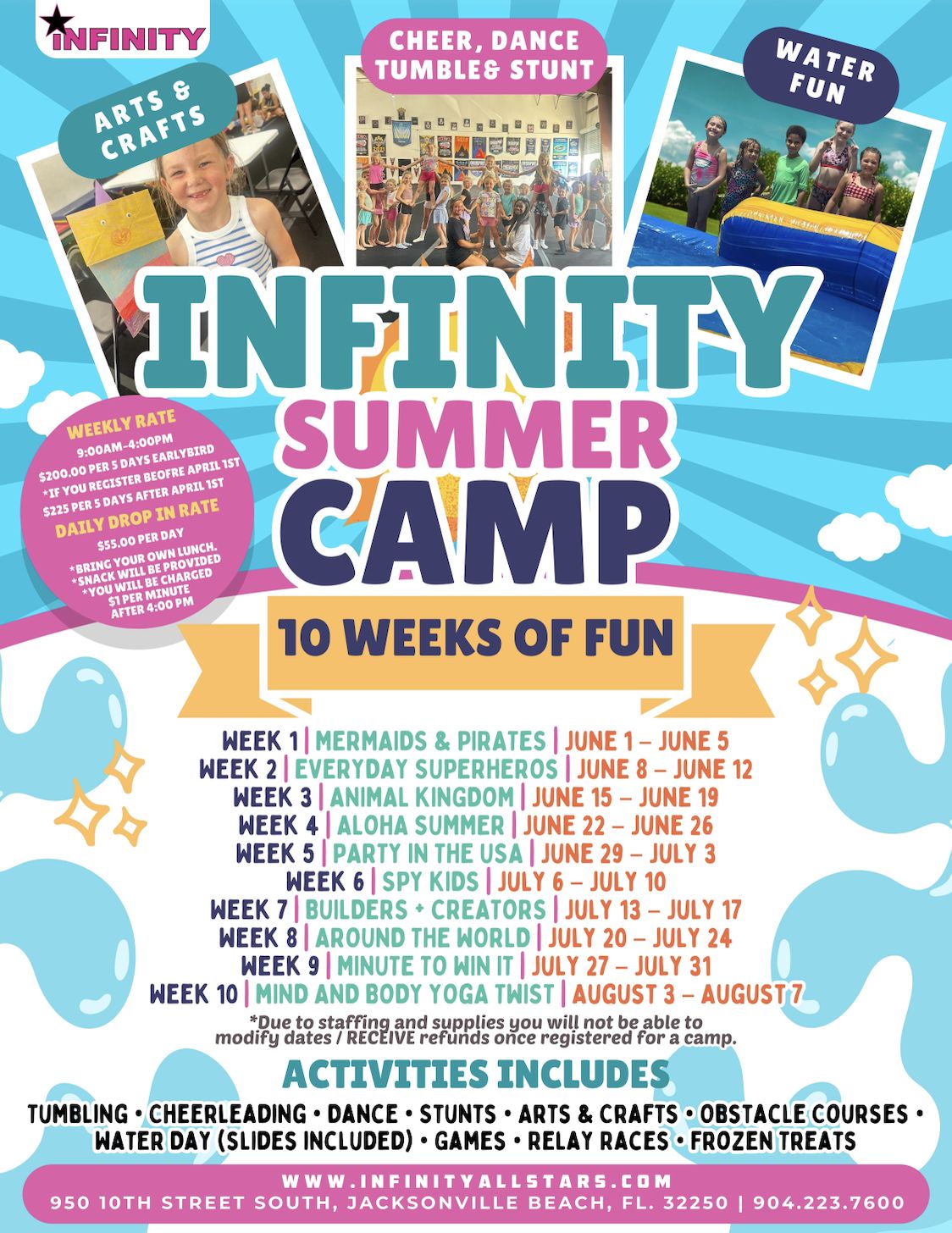 Thank you for your interest in being part of the Infinity FAMILY! Our mission at Infinity is to provide the best experience to athletes of all ages and skill level. We strive to make our sport a fun, safe and positive activity that will help develop teamwork, commitment, self-confidence and personal character. Our Infinity staff takes a personal interest in every child that walks through our door and we promise to challenge and push all athletes to reach their full potential.